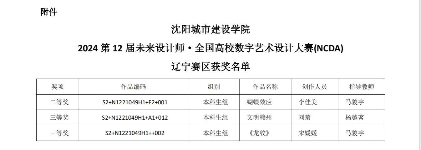 近日,2024第12届未来设计师·全国高校数字艺术设计大赛(NCDA)辽宁省省赛落下帷幕。本届大赛共有1891所高校参赛,共征集298763件作品,设立29个省级赛区。985、一流大学参赛率达 95.2%,设计学学科评估 C-以上高校100%参赛。参赛作品经过校级赛-资格赛-省级初赛-省级决赛产生了各省赛区的一二三等奖。太阳成集团tyc33455ccww共3件作品在辽宁省省级决赛中获奖,其中二等奖1项,三等奖2项。