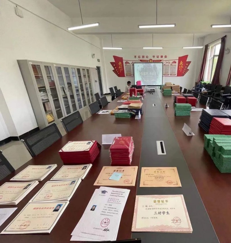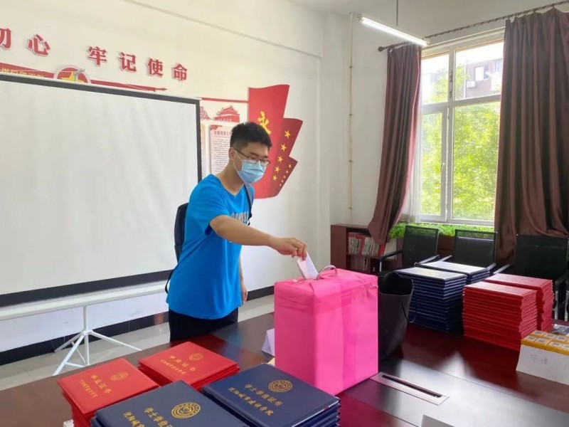 在毕业物品发放前,毕业生辅导员带领学生做了精心的准备。6月21日上午8点30分开始,2021届毕业生在会议室排队领取证书、纪念品,秩序井然。领取现场,毕业生辅导员向莘莘学子们道出希冀和嘱托,为同学们答疑解惑,并仔细核对信息,防止出现疏忽和遗漏。