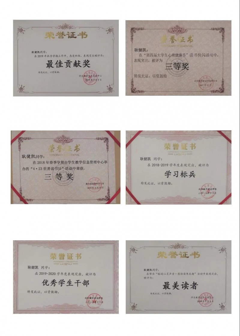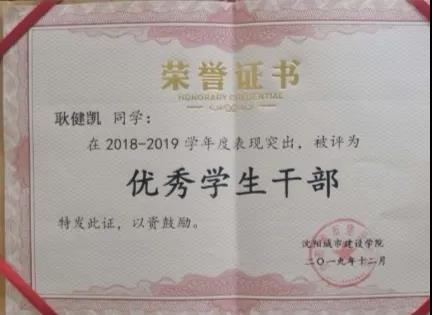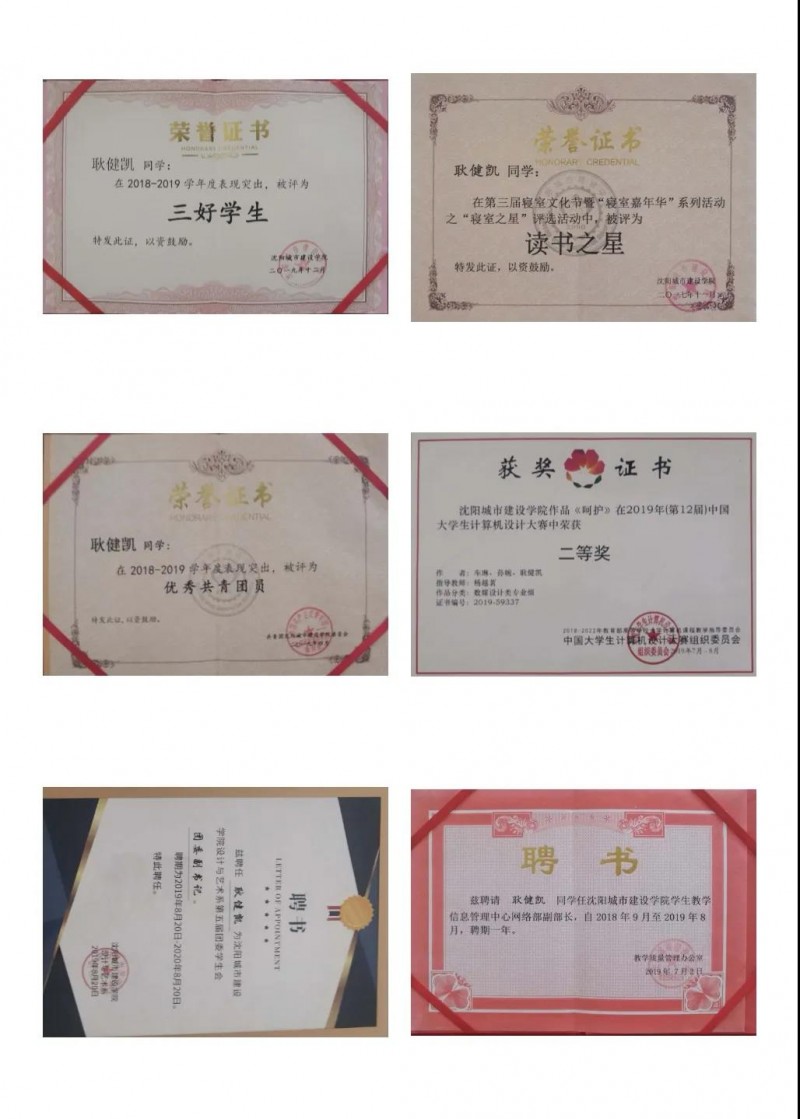 耿健凯,男,汉族,中共党员,1998年7月29日出生。2017年进入tyc33455cc太阳成集团设计与艺术系视觉传达设计(中职升本)17级1班学习,通过竞选担任班级学习委员,同年九月份向党组织提交入党申请书。在大三学年担任设计与艺术系团委学生会团委副书记,沈阳城市学院学生教学信息质量中心网络部部长,并于2019年6月份成为一名光荣的中共党员。