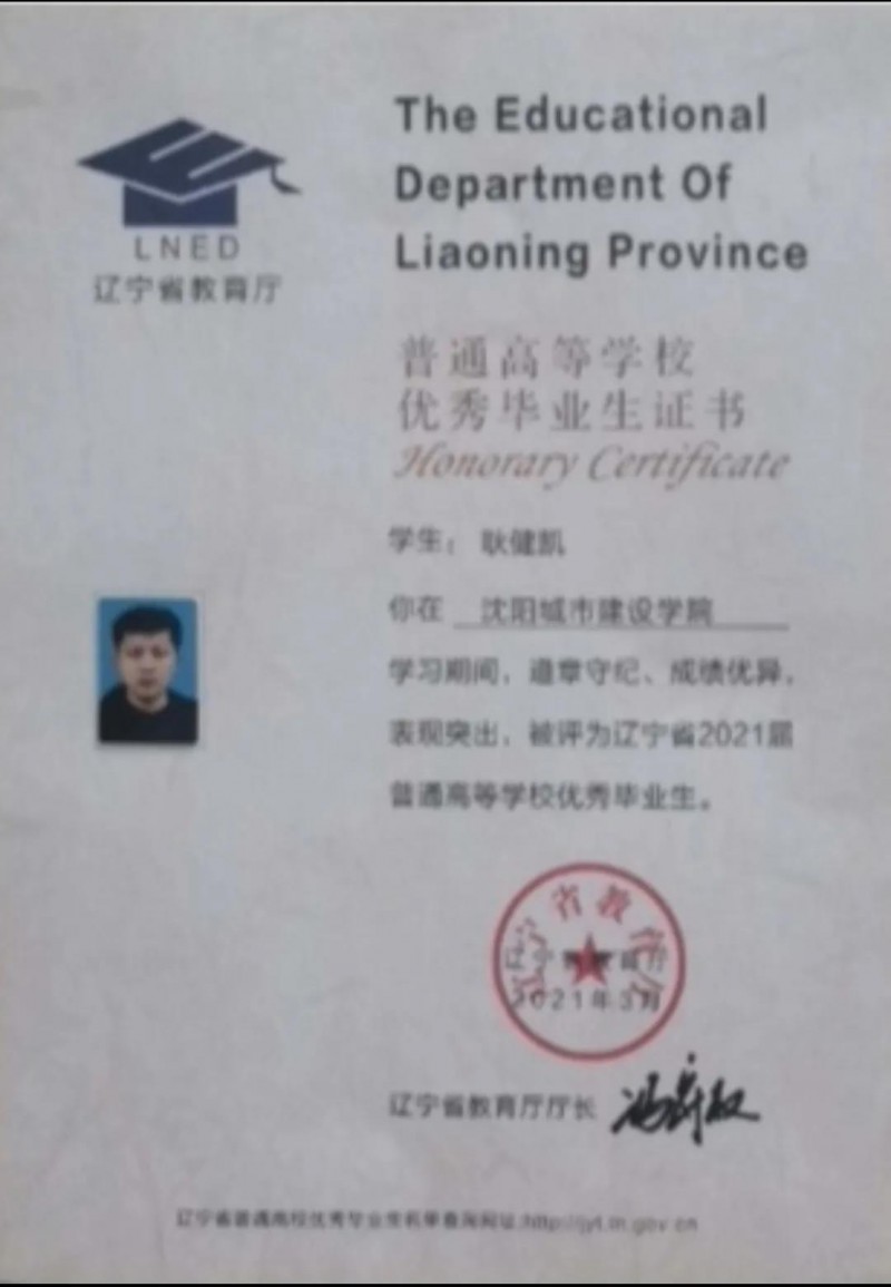 2021年度辽宁省2021届普通高等学校优秀毕业生。