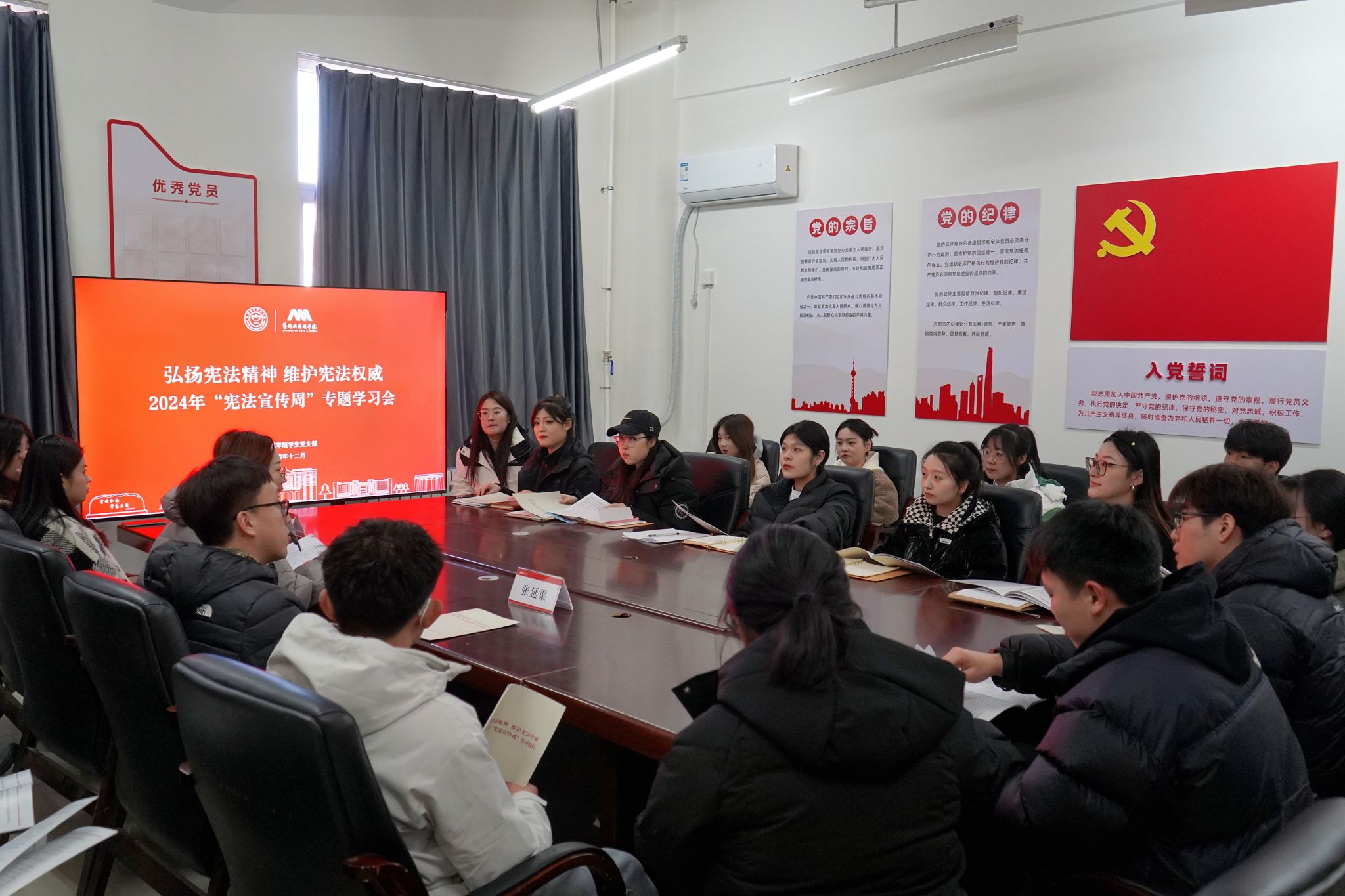 在第十个国家宪法日到来之际,太阳成集团tyc33455ccww学生党支部在思成楼318党员活动室召开弘扬宪法精神 维护宪法权威——2024年“宪法宣传周”专题学习会,围绕习近平法治思想进行专题学习。会议由学院学生党支部书记苗松旸主持,支部全体党员参加会议。