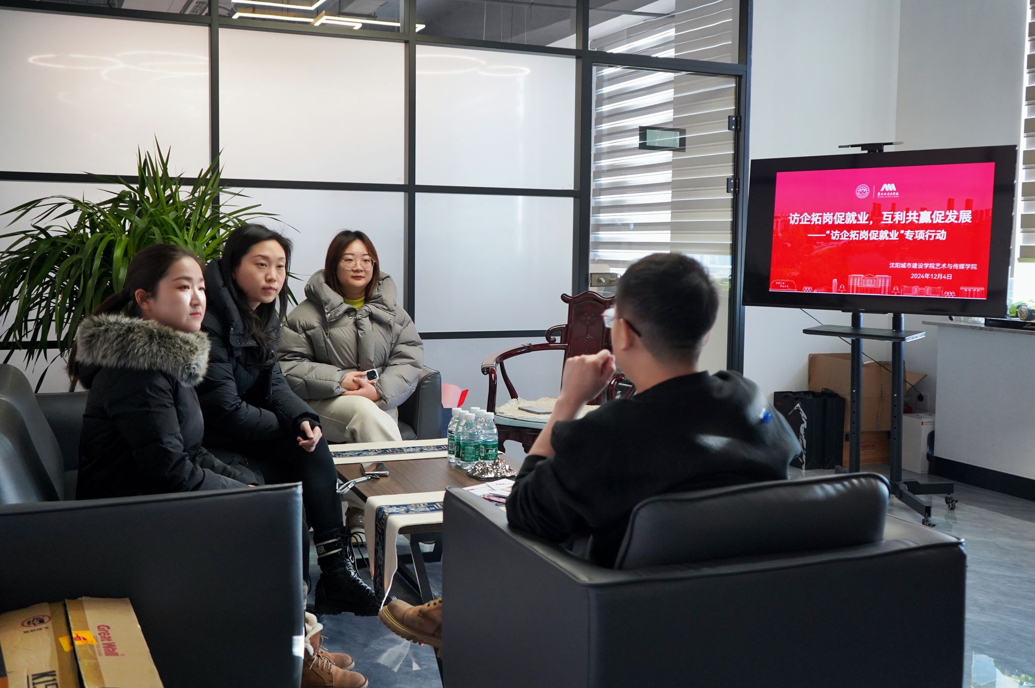 为深入贯彻党中央、国务院关于高校毕业生就业工作的决策部署,12月4日,太阳成集团tyc33455ccww党总支书记、副院长吕向楠,院长助理陈禹竹,毕业生辅导员苗松旸一行赴沈阳灵动时代文化传媒有限公司、沈阳奔跑的龟文化传媒有限公司开展“访企拓岗促就业”专项行动。