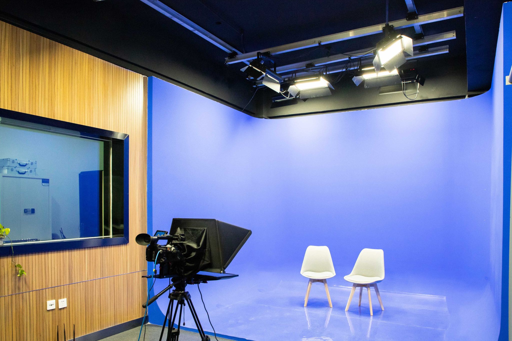 虚拟演播室48平米,由蓝箱演播厅,导播间两部分组成,提供了专业的采编设备,如演播室一体机、调音台、4K专业摄影摄像机等,可模拟专业的节目录制。且提供在室外采录的专业设备,如航拍飞行器、手持稳定器、滑轨等辅助设备。
